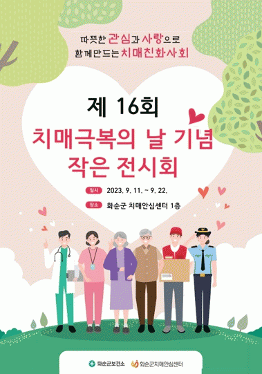 치매 극복의 날 기념 작은 전시회는 화순군 치매안심센터 1층 로비에서 열리며 치매 프로그램에 참여했던 치매 환자와 가족들의 작품 전시와 활동 사진전이 행사 기간 동안 개최된다.