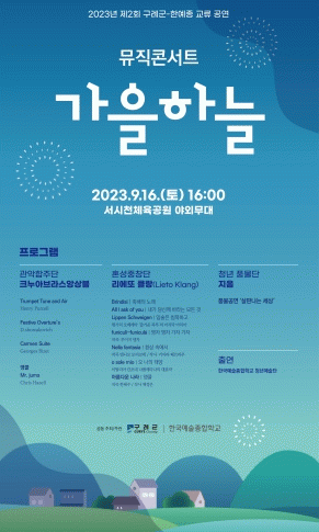 한편, 김순호 구례군수는 “한국예술종합학교의 재학생 및 졸업생들의 젊은 에너지가 군민들에게 색다른 감동과 즐거움을 선사하고, 더불어 초가을의 아름다움을 만끽하는 행복한 시간 보내시길 바란다.”고 말했다.