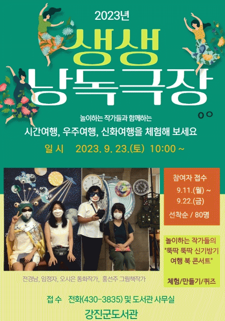 제1회 생생 낭독극장은 오는 23일 오전 10시 ‘뚝딱뚝딱 신기방기 여행 북 콘서트’란 주제로 진행된다.