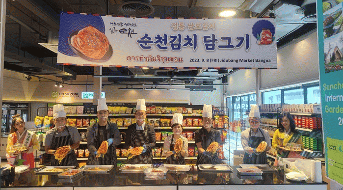 지난 8일에는 지두방마켓 방나점(방콕)에서 순천양념 김치담그기 행사를 열었다. 순천시 농식품유통과장이 참석한 가운데 방콕 한인회, aT 방콕지사 등에서 참여해 순천양념을 이용한 김치를 담가 현지 소비자 시식과 함께 방콕 한인회에서 추천한 유학생 및 소외계층에게 전달했다.