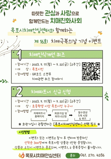치매인식개선 퀴즈는 목포시 치매안심센터 누리집 및 SNS(페이스북, 인스타그램)에 게재된 QR코드 인식하거나 치매안심센터 방문을 통해 참여할 수 있다.