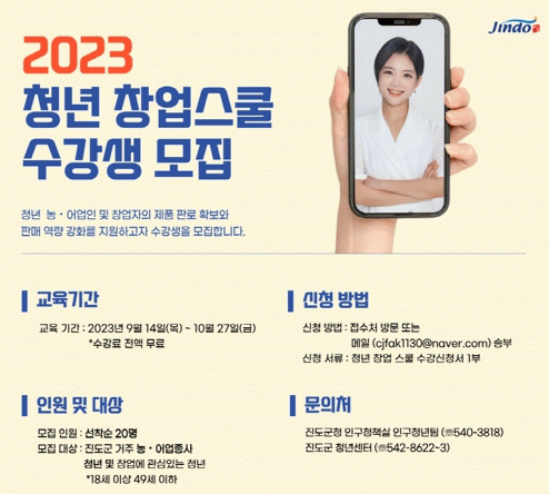 교육은 오는 9월 14일부터 6주동안 청년센터에서 진도군에 거주하고 있는 18세 이상 49세 이하 청년 20명을 대상으로 매주 목, 금요일, 총 12회 진행된다.