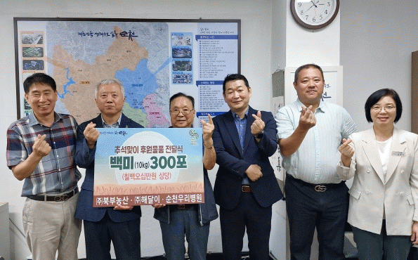㈜북부농산은 지난 설 명절과 8월에도 100포를 기탁했고, ㈜해달이 역시 지난 8월에 100포를, 순천우리병원은 지난 5월에 200포를 기탁한 바 있으며, 꾸준히 나눔을 실천해 주위의 귀감이 되고 있다.