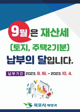 9월분 재산세는 과세기준일(6월 1일) 현재 주택과 토지의 소유자에게 주택분 재산세액의 50%(연간 재산세 부과세액이 20만원 이하는 7월에 전액 부과)와 토지분이 부과된다.