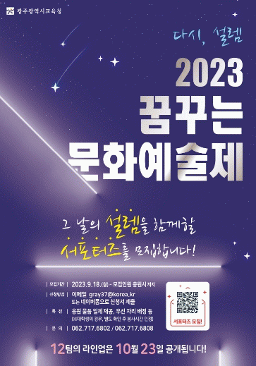 서포터즈는 특수교육대상학생과 가족, 학생, 교직원을 포함해 누구나 참여가능하다. 앞으로 행사의 조력자이자 참가자, 관객으로서 이번 축제에 함께하게 된다. 신청은 꿈꾸는 문화예술제 운영팀 이메일 접수 및 누리집 접수를 통해 가능하다. 선정 결과는 오는 10월 31일 광주특수교육지원센터 누리집과 학교로 안내된 공문을 통해 확인할 수 있다.