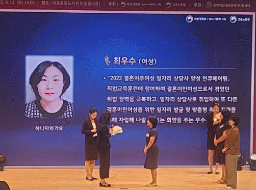 시상식은 9월 12일 마포중앙도서관에서 개최한 “2023 경력단절 예방 실천 다짐 및 새일센터 유공 포상식” 행사에서 진행했다.