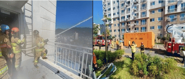 화재진압 훈련은 실제 화재 상황을 가정하여 ▲ 인명대피 및 굴절사다리차를 활용한 인명구조 ▲ 아파트 내 옥내소화전 등을 활용한 진압훈련 ▲ 실질적이고 체계적인 고층건물 화재 진압 및 구조훈련 등을 실시했다.