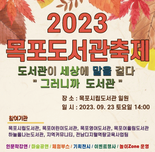 목포시립도서관 일원에서 진행될 이번 축제는 목포어린이도서관, 목포영어도서관, 목포어울림도서관, 하늘을나는도서관, 지역커뮤니티, 전남디지털역량교육사업팀이 함께 참여해 명실공히 지역도서관 대표축제로 성대하게 펼쳐질 예정이다.