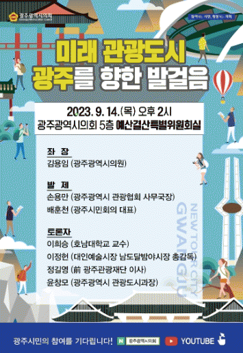 ‘미래 관광도시 광주를 향한 발걸음’을 주제로 한 토론회는 9월 14일 오후 2시, 광주시의회 5층에서 개최된다.