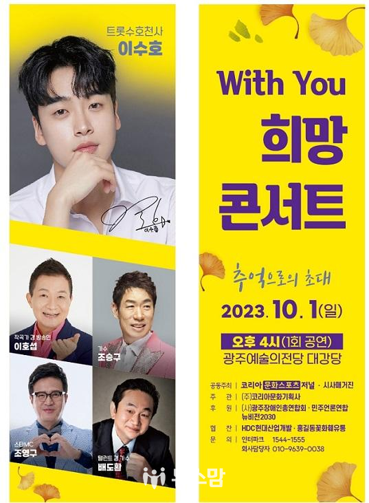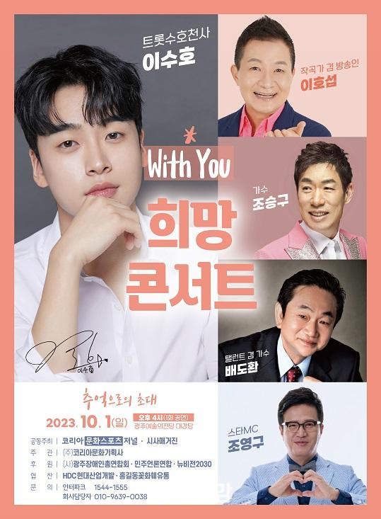 (주)코리아문화기획사가 주관하는 이번 'With You! 희망콘서트'는 (사)광주장애인총연합회, 뉴비전2030, 뉴스그룹NGTV, 전남방송,뉴스통외 18개 언론사 모임인 '민주언론연합'이 후원하고, HDC현대산업개발이 협찬해서 진행한다.