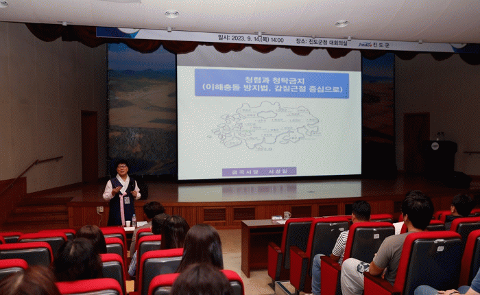 진도군청 대회의실에서 지난 14일 금곡서당 훈장이자 청렴교육 전문강사인 서상일 전문강사를 초청 반부패?청렴 및 고충민원 처리 역량강화 교육을 실시했다.