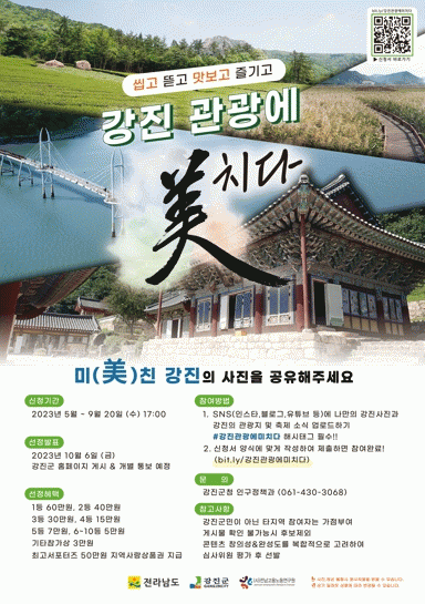 또 SNS 서포터즈를 ‘강진 관광에 미치다’라는 주제로 오는 20일까지 강진 관광에 관심이 많은 관광객들을 대상으로 강진의 아름다움과 개성을 홍보하고 다양한 콘텐츠로 강진 관광 SNS의 활성화를 도모하기위해 서포터즈를 모집한다.