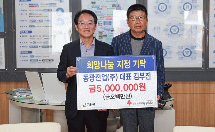 동광전업(주)는 폐기물 종합재활용업, 레미콘 제조업, 콘크리트 타일 등을 생산하는 기업으로 지난 2020년부터 2022년까지 도암면지역사회보장협의체에 3회에 걸쳐 600만 원을 기탁, 2022년부터 2023년 상반기까지 2회에 걸쳐 강진군에 1,000만원을 기탁하는 등 소외계층을 위한 나눔을 꾸준히 실천해오고 있다.