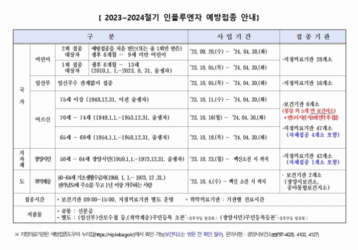 독감 예방접종 기간은 오는 20일부터 2024년 4월 30일까지며, 대상별·연령대별 접종 시기가 다르므로 접종 전 반드시 광양시 누리집에서 확인해야 한다.