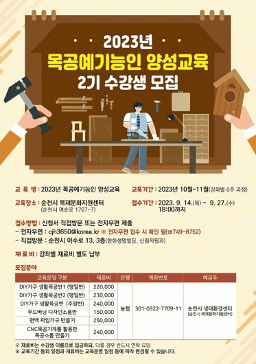 이번 과정은 10월부터 6주간 DIY가구 생활목공, 편백짜임가구 만들기, 우드버닝디자인소품 등 6개 교육과정으로 운영된다.