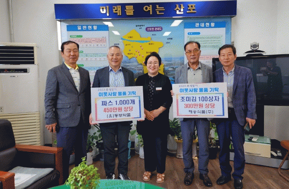 이재덕 산포면장은 “어려운 경기 여건 속에서도 매년 명절에 어려운 이웃과 나눔을 실천해준 두 업체 대표께 감사드린다”며 “홀몸 어르신과 저소득 취약계층이 풍성한 명절을 지낼 수 있도록 잘 전달하겠다”고 밝혔다.