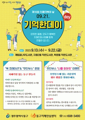이번 행사는 계림꿈나무도서관, 지원2동 작은도서관, 학운동 작은 도서관 등 3곳에서 진행된다. 주요 내용으로는 치매 관련 도서를 선별해 독자에게 제공하는 북큐레이션, 치매안심센터 홍보를 위한 무인 부스, 치매 인식 개선퀴즈 ‘정답을 맞추는 나를 찾아줘’ 이벤트 운영 등으로 남녀노소 누구나 참여 가능한 프로그램으로 구성됐다. 기타 자세한 사항은 동구치매안심센터로 문의하면 된다.