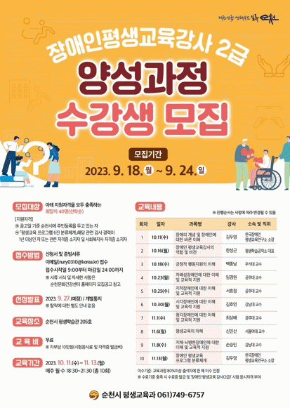 자세한 사항은 순천문화건강센터 누리집 공지사항을 확인하거나, 평생교육과로 문의하면 된다.