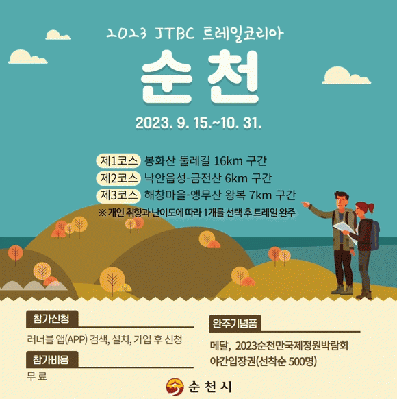시는 트레일 완주자에게 순천역 관광안내소에서 특별 제작된 ‘완주 메달’과 ‘2023순천만국제정원박람회 야간입장권’을 선착순 500명에게 제공한다.