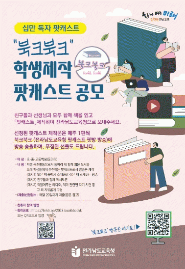 ‘북크북크’는 책을 읽은 학생은 독후활동으로, 청취하는 학생은 독서 동기를 부여받으며 서로에게 책을 권하며 점진적으로 책읽는 분위기를 확산하기 위해 전라남도교육청이 제작하는 일명 ‘십만독자팟캐스트’ 방송이다.