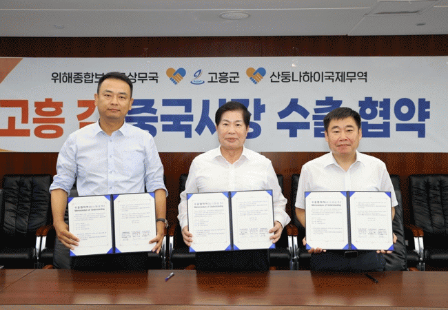 고흥군 농수산물 수출개척단은 중국에서 ▲웨이하이 상무국·산둥 나하이 국제무역과 500만 불 ▲산둥 풔쿤 투자그룹과 500만 불 ▲상하이 민허제상무유한공사와 500만 불 수출협약을 각각 체결했다.