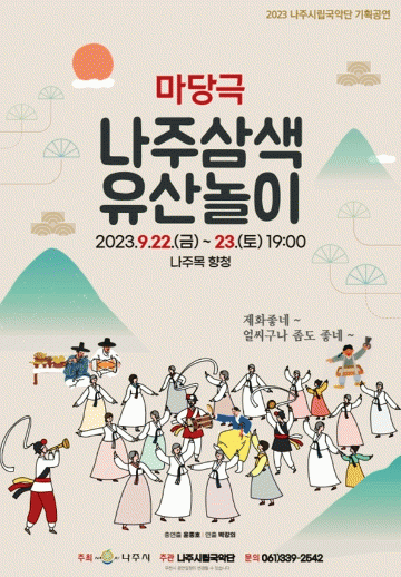 나주시는 오는 22일과 23일 이틀 간 오후 7시부터 나주목 향청 특설무대에서 나주시립국악단의 ‘마당극 삼색유산놀이’가 펼쳐진다고 18일 밝혔다.