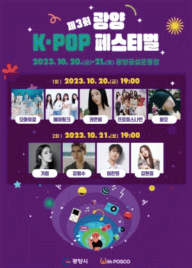 임채기 관광문화환경국장은 “올해로 제3회를 맞는 광양 K-POP 페스티벌은 시민에게 수준 높은 문화 향유 기회를 제공하고 글로벌 관광문화도시로 우리 시의 위상과 경쟁력을 높여 왔다”며 “특히, 올해는 포스코와 협력해 전 세대가 함께하는 페스티벌로 확대 추진하게 됐다”고 말했다.