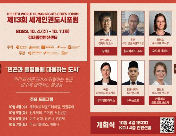 라운드테이블에서는 강기정 광주시장, 김미경 한국인권도시협의회장 겸 은평구청장, 카롤리나 즈드로도브스카 폴란드 바르샤바 부시장, 비키 펠트하우스 독일 라히프치히 부시장, 수마스트로 인도네시아 싱카왕 시장, 모르텐 샤에름 스웨덴 라울발렌베리연구소장이 참여해 각 도시의 빈곤과 불평등에 대응하는 주요 정책을 공유한다.