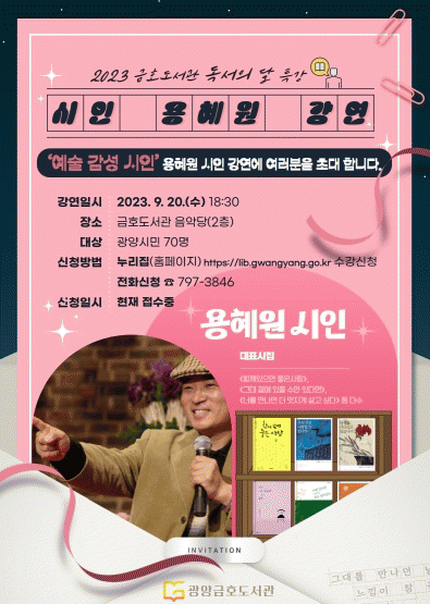 이용민 금호도서관팀장은 “독서의 달을 맞아 시와 함께 따뜻한 이야기로 시민들이 휴식을 취하는 시간이 되도록 강연을 준비했다”며 “감동이 있는 시 한 구절을 통해 삶의 원동력을 얻어가는 시간이 되길 바란다”고 말했다.