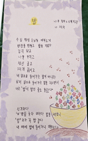 시화부문은 중부노인복지관 소속 나재숙 씨의 작품 ‘밥’(제목)이 국회교육위원장상(글아름상)을, 죽동마을 나영자 씨의 ‘우리마을 국화’, 박실마을 문영순 씨의 ‘한글공부’, 풀뿌리희망문화학교마을 최아임 씨의 ‘내 이름’이 전남인재평생교육진흥원장상을 수상한다.