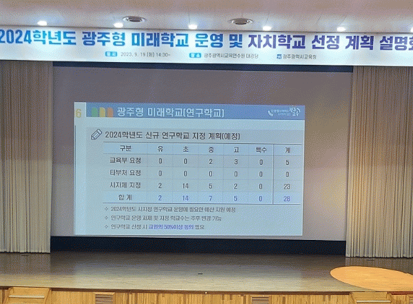 한편 시교육청은 이번 설명회에서 자치학교와 다른 유형의 광주형 미래학교인 혁신학교, 연구학교의 경우 내년도 혁신학교는 67교, 연구학교는 40교 내외로 운영할 계획이라고 밝혔다.