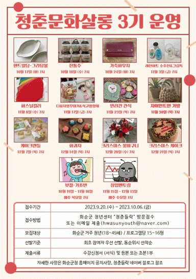 한편, 화순군은 지난 6월에서 8월에 ‘2023 화순군 청춘 문화 살롱’ 2기를 운영하여 144명의 수강생이 프로그램을 수강했다.