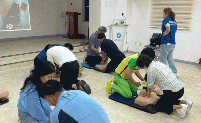 이번 교육은 ▲일반인 심폐소생술 기본 ▲자동심장충격기 관리 방법 순서로 이론과 마네킹을 이용한 1:1 실습이 함께 진행됐다.
