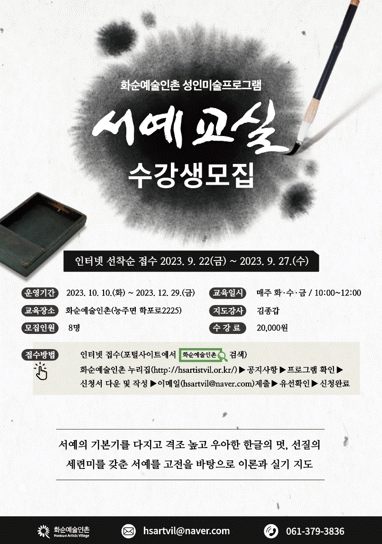 화순예술인촌 ‘서예 교실’ 프로그램 수강 신청 기간은 9월 22일 금요일부터 9월 27일 수요일까지이며, 모집인원은 8명이다. 서예에 관심 있는 주민(만 20세 이상 성인)은 누구나 신청할 수 있다. 수강료는 2만 원이다.