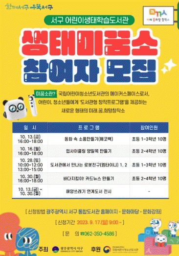 신청은 광주 서구 통합도서관 홈페이지를 통해 선착순으로 접수받고 있으며, 기타 자세한 사항은 어린이생태학습도서관으로 문의하면 된다.