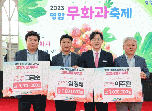 15일 ‘2023 무화과축제’ 행사장에서는 삼호읍 향우 고금순 씨가 300만 원을, 임정태 ㈜ 윌링스 이사가 100만 원을, 이주환 ㈜태영ENC 청주 대표가 100만 원을 기부했다.