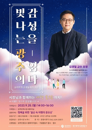 이번 강연은 ‘행복을 위한 일상 속 여행의 중요성’이라는 주제로 일상에서 누리는 여행의 의미와 가치, 행복을 어떻게 찾아야 하는지에 대해 광주의 독특한 문화와 예술 콘텐츠를 엮어 이야기를 풀어낸다.