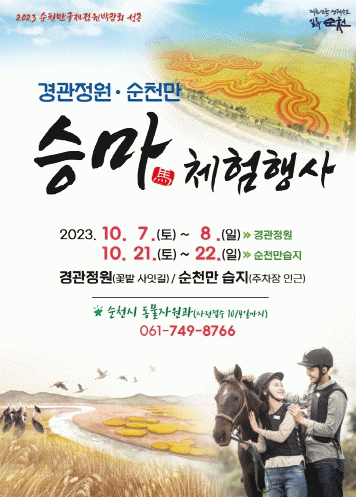 1회차(10. 7.~10. 8.) 승마체험행사는 풍덕동 일원에 조성된 경관정원에서 가을 꽃길 사이를 말을 타고 걸어보는 체험으로 진행되고, 2회차(10. 21.~10. 22)는 순천만 습지 주자창 인근에서 말을 타고 갈대길을 걸어보는 관광이 결합된 행사로 진행된다.