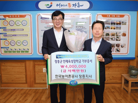 한국농어촌공사 장흥지사는 2012년부터 2022년까지 장흥군의 인재 육성을 위해 장학회에 총 1천 5백만 원을 꾸준히 기부해 왔다.