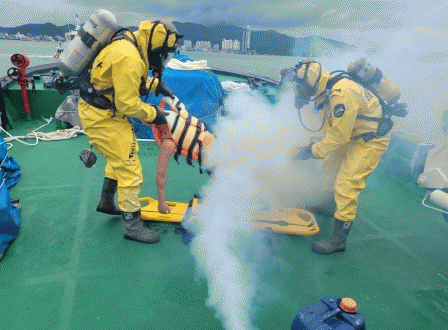 이번 훈련은 완도항에 정박 중인 양식장관리선 화재발생, 적재 중인 염산용기 가열로 염화수소가스가 누출된 상황을 가상하여 실시했으며, 완도해경·완도군·완도소방서·해양환경공단 4개 기관에서 50여명이 참여했다.