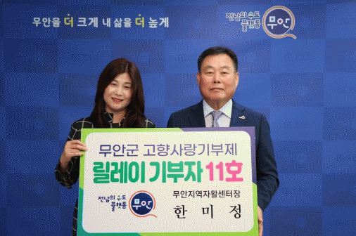 지난 22일 군수실에서 열린 무안군 고향사랑기부 릴레이의 열한 번째 주자로 나선 무안지역자활센터 한미정 센터장은 무안군청 사회복지과 김진순 과장의 소개로 참여하게 됐으며, 고향사랑기부금 100만 원을 기탁하며 고향사랑기부제의 활성화와 무안군의 발전을 응원했다.