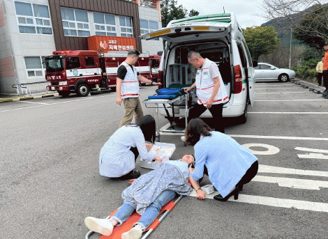 이날 고흥군 보건소 자위소방대와 고흥소방서와 함께 보건소 1층에서 발생한 원인 불명의 화재를 가정해 실전과 같은 훈련을 펼쳤다.