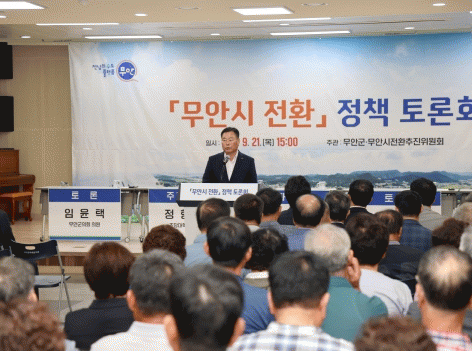 지난 21일 승달문화예술회관에서 무안군과 무안시전환추진위원회가 공동주관하여 “무안시 전환 정책 토론회”를 개최했으며 김경현 무안군의회의장, 정길수 전남도의원, 이수용 무안시전환추진위원회 위원장 등 군·읍면 기관사회단체장을 비롯한 200여 명의 군민이 참석했다.