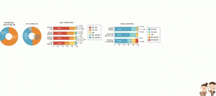 추가 출산에 필요한 부분으로 ‘육아비용 상향’이 39.6%로 가장 높았고, 다음으로 일·생활균형 양립환경 조성(20.1%), 믿고 맡길만한 보육시설 확충(15.4%), 주택마련 자금지원(10.1%), 고용불안정 및 낮은 소득수준 해소(4.1%)가 뒤를 이었다.
