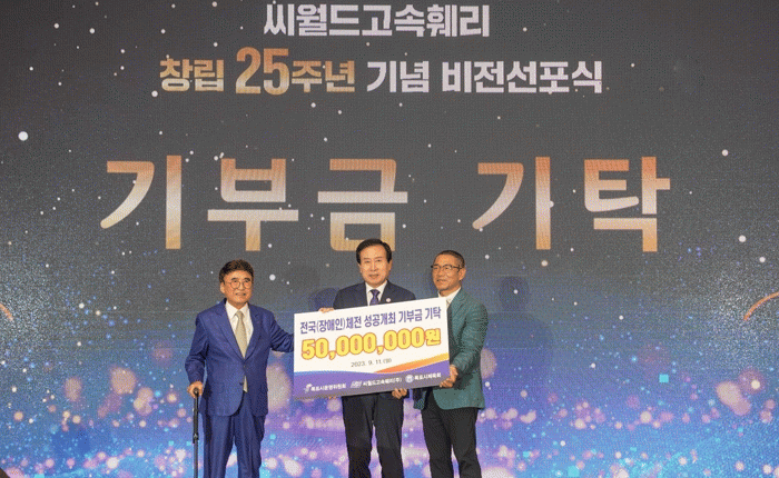 지난 11일 씨월드고속훼리(주) 창립 25주년 기념식 행사장에서 이혁영 회장과 박홍률 목포시장, 김성대 목포시체육회장이 참석한 가운데 기부금 기탁식이 진행됐다.