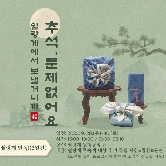 쉴랑게 원형광장 주변에는 대형 보름달과 토끼 조형물을 설치해 낭만적인 추석 분위기를 조성하고, 9월 한정으로 운영 중인 ‘찍으랑게(사진인화 서비스)’는 토끼 머리띠, 차례음식 일러스트 등 이색소품을 추가해 운영할 계획이다.