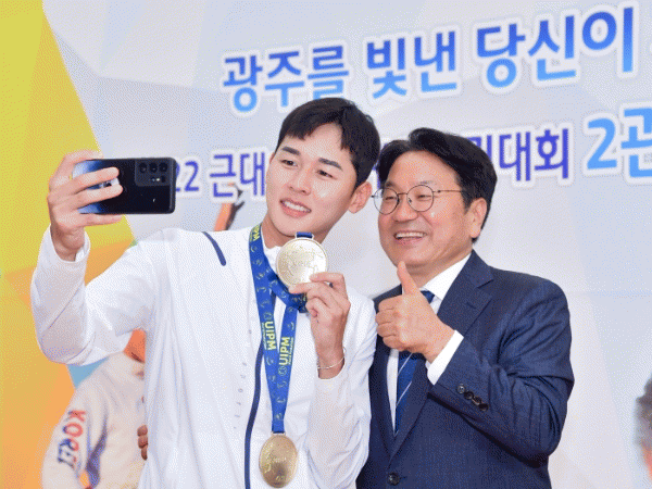 강기정 광주광역시장이 ‘항저우 아시안게임’ 한국 첫 2관왕 근대5종에서 개인.단체전 금메달을 획득한 전웅태 선수(28·광주광역시청)에게 축하 메시지를 전했다.