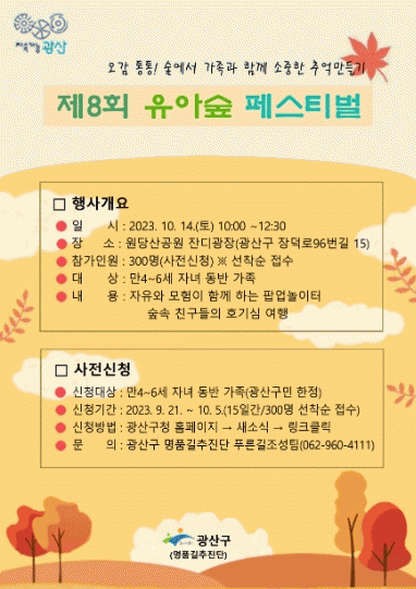 참여자는 광산구에 거주하는 6~8세 유아 동반 가족 300명을 선착순으로 모집한다. 신청은 광산구 누리집 ‘새소식’란을 참고하거나 광산구 명품길추진단 푸른길조성팀으로 전화 문의하면 된다.