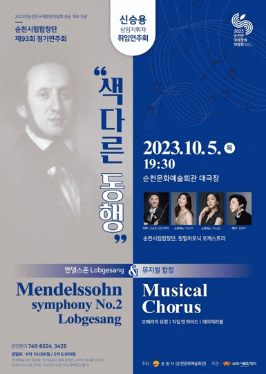 이번 공연은 지난 8월 취임한 신승용 상임지휘자의 취임연주회로‘멘델스존의 심포니 2번 LOBGESANG & 뮤지컬 합창’을 순천시립합창단과 특별출연 소프라노 전수미, 박선영과 테너 김래주의 협연으로 연주해 클래식과 뮤지컬 합창의 화려한 조화로 시민에게 감동적인 경험을 선사할 것으로 기대된다.