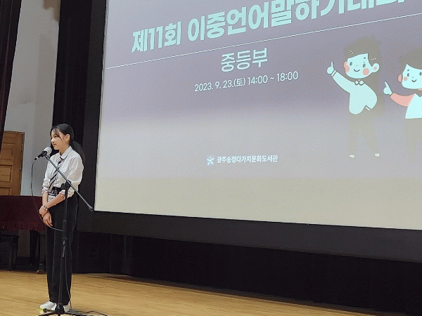 송정다가치문화도서관에 따르면 ‘이중언어말하기 대회’는 부모나라 언어와 한국어로 자기 생각을 자유롭게 발표하는 대회이다. 다문화학생의 자존감을 높이고 글로벌 인재로 성장하도록 돕기 위한 이 대회는 지난 2013년부터 매년 개최하고 있으며, 올해로 11번째를 맞았다.